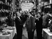 Bei der Heimkehr aus dem Urlaub wird der brave Gottlieb Sänger (Heinz Erhardt, Mi.) von der ganzen Redaktion wie ein Sieger gefeiert. Auch der Chef (Ernst Waldow, li.) spricht ihm seinen Dank aus, denn er hat die Feriennummer der Zeitschrift "Zeitblick" gerettet und zur Steigerung der Auflage beigetragen.Bild: © ZDF und Deutsche Film Hansa