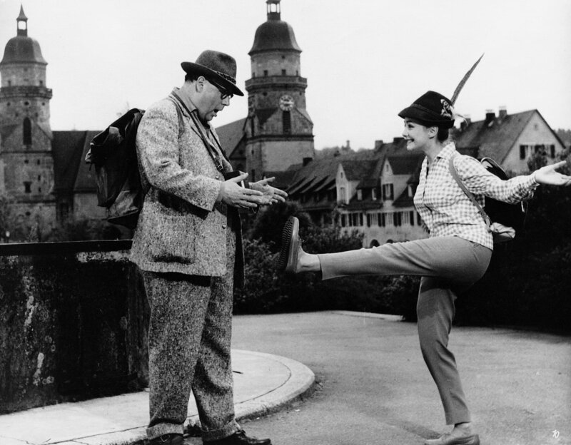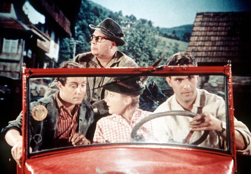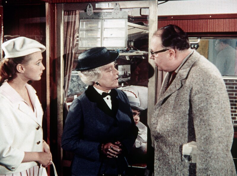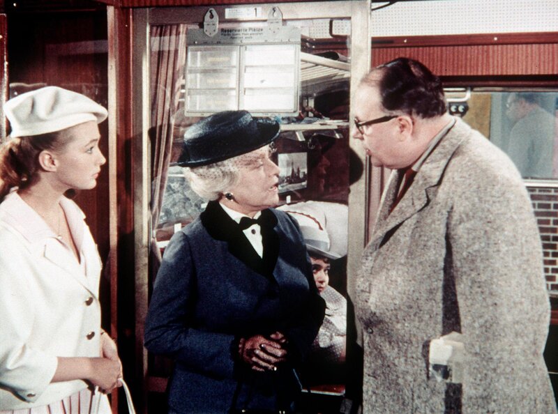 Der biedere Zeitungsarchivar Gottlieb Sänger freut sich auf seine lang geplante Wanderung durch den Schwarzwald. Im Zug nach Baden-Baden vertraut ihm eine ältere Dame ihre aufgeweckte Enkelin Kiki an. Das Mädchen soll eigentlich auf schnellstem Wege in das Schulpensionat nach Genf zurückgebracht werden. Dock Kiki will lieber Gottlieb auf seiner Wanderung begleiten. Im Bild: Heinz Erhardt, Christine Kaufmann, Käthe Haack.Bild: © ORF/BT