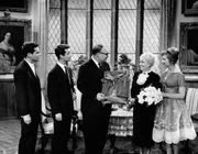 13. Nach vielen Aufregungen eine fröhliche Wiedersehensfeier bei Kikis (Christine Kaufmann, re.) Großmama, Frau von Hartwig (Käthe Haack), zu der außer Gottlieb Sänger (Heinz Erhardt, Mi.) auch die beiden Studenten Rudi (Michael Lenz, li.) und Max (Peter Wengen, 2.v.li.) geladen sind.Bild: © ZDF und Deutsche Film Hansa