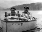 Am Schluß einer langen Wanderung gibt es eine Erholung am Wasser. Kiki (Christine Kaufmann) genießt die Bootspartie mit Übermut, aber auch Gottlieb Sänger (Heinz Erhardt) ist inzwischen etwas aufgetaut.Bild: © ZDF, Deutsche Film Hansa
