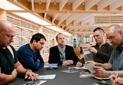 Ludger (Lars Rudolph, hinten li.) beobachtet wie Robert (Peter Heinrich Brix, li.) und sein Vorgesetzter, der Macho Horst Hoff (Ralph Herforth), sich einmal mehr ein Wortgefecht liefern.Bild: © NDR/ARD Degeto/Carsten Schick