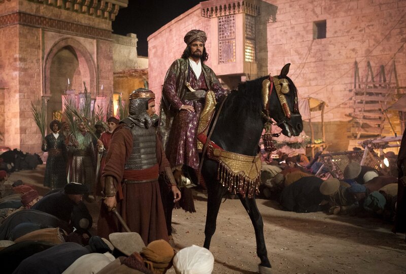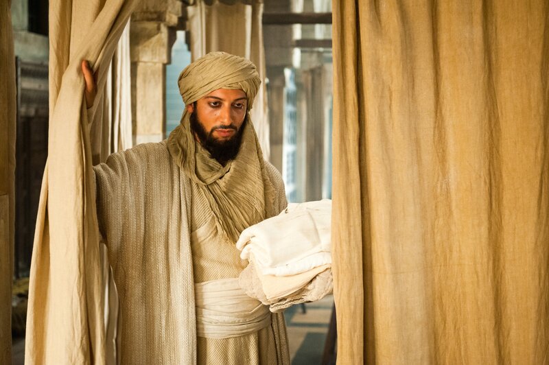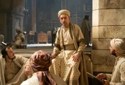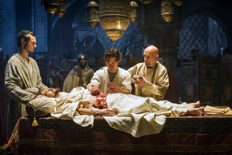 Unter Mithilfe seines Meisters Ibn Sina (Ben Kingsley, re.) und seinem Mitstudenten Mirdin (Michael Marcus, li.) führt Rob (Tom Payne, Mitte) bei dem erkrankten Schah (Oliver Martinez) eine Blinddarmoperation durch.
