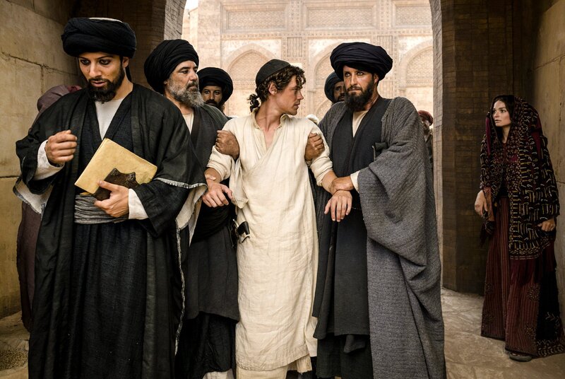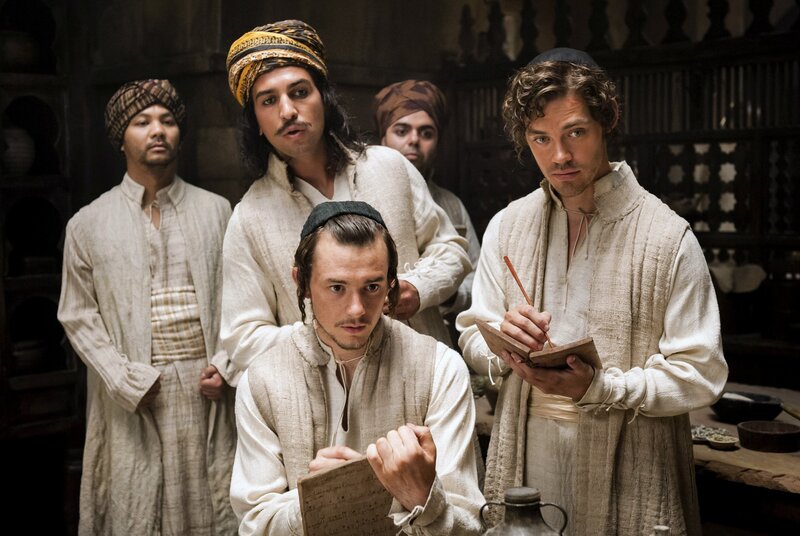 Der junge Rob Cole (Tom Payne, re.) studiert in Isfahan gemeinsam mit dem Perser Karim (Elyas M’Barek, 2. v. li.) und dem Juden Mirdin (Michael Marcus).