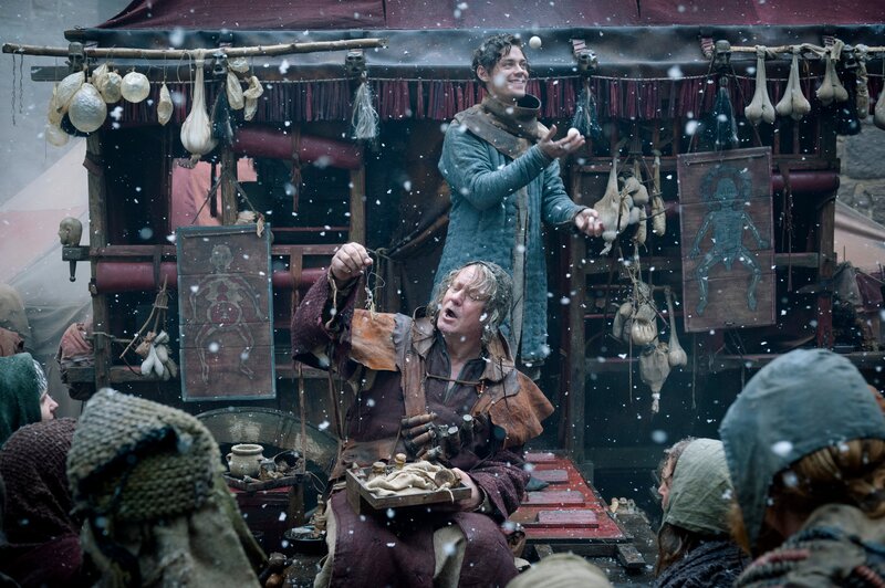 Der fahrende Bader (Stellan Skarsgård, li.) bietet marktschreierisch seine bescheidenen Heilkräfte an. Sein junger Schüler Rob Cole (Tom Payne) unterhält die potentielle Kundschaft in der Zwischenzeit mit kleinen Kunststückchen.