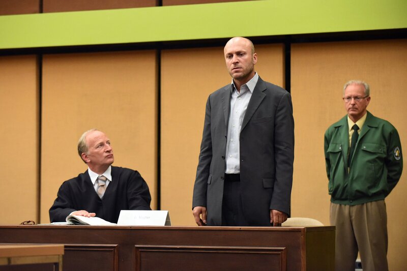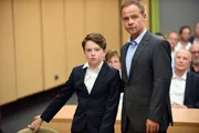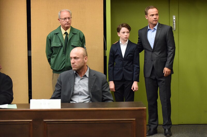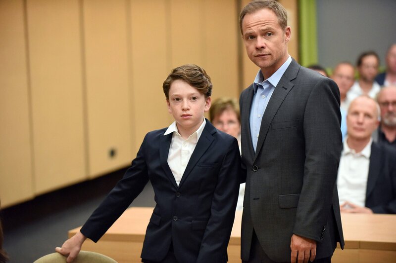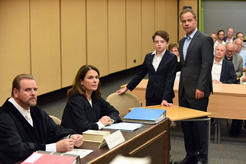 Die Anwâltin Frau Zech (Barbara Auer) und Carlos Benede (Matthias Koeberlin) stehen Alexander (Joshio Marlon, mi) bei, als er im Prozess gegen seinen Vater aussagen muss.