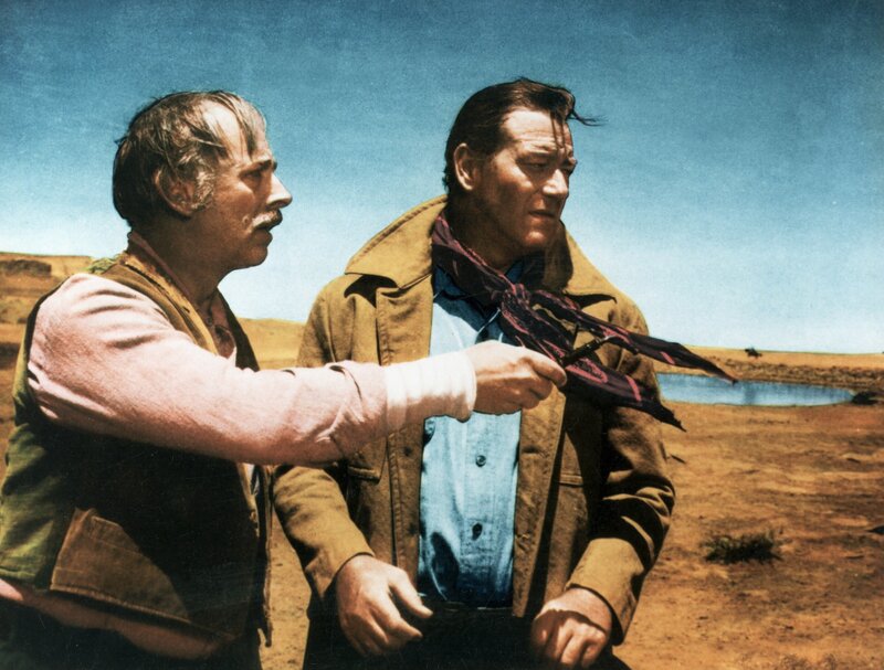 Lars Jorgensen (John Qualen, l.) zeigt Ethan Edwards (John Wayne, r.) in welche Richtung die Komantschen abgezogen sind ...Bild: © Warner Bros