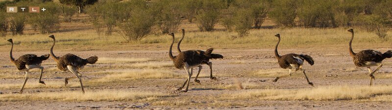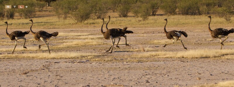 Junge Strauße bleiben in Gruppen, durch gemeinsames Beobachten lassen sich Gefahren schneller erkennen. +++ Die Verwendung des sendungsbezogenen Materials ist nur mit dem Hinweis und Verlinkung auf RTL+ gestattet. +++Bild: © RTL / Terra Mater_Mike Birkhead