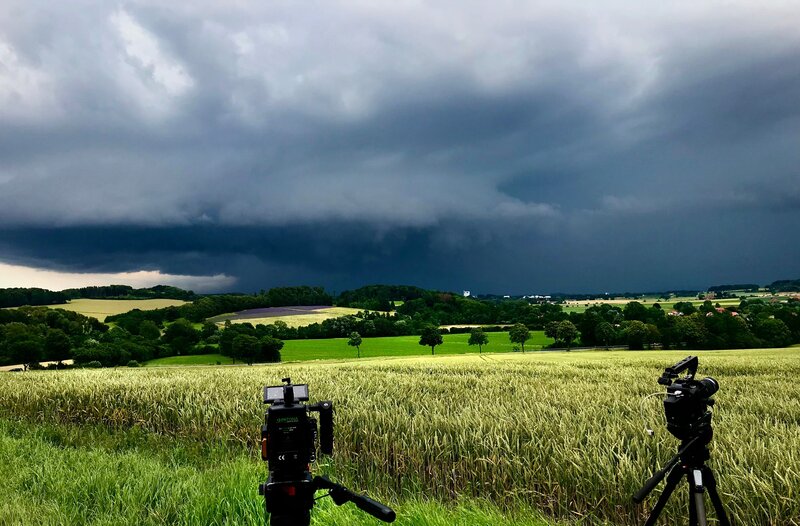 Eine Freude für den Sturmjäger: Die so genannte Shelfcloud. So nennt man die keilförmige Wolkenformation, die sich vor einem Gewitter über den Himmel schiebt - wie ein Welle. Dahinter folgt das eigentliche Unwetter.Bild: © WDR/Längengrad Filmproduktion/Robin Jähne