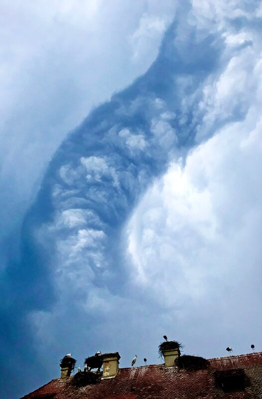 Sturmgepeitscht: Die vordere Kante einer großen Gewitterwolke rast über die Störche hinweg. Dabei entsteht eine Wolkenwelle, die über das Land schwappt - ähnlich einer Meereswelle von unten gesehen.Bild: © WDR/Längengrad Filmproduktion/Robin Jähne