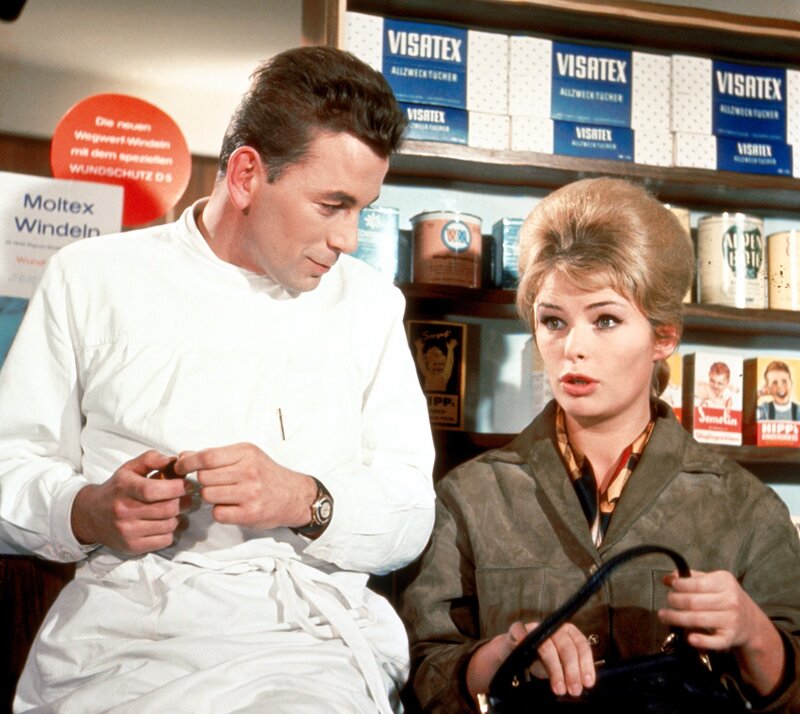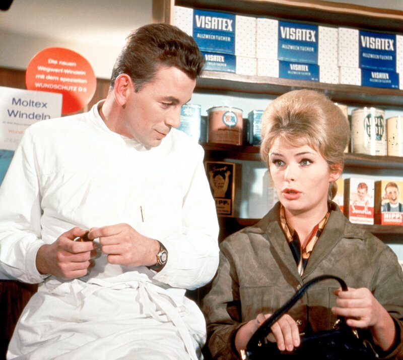 ARD DER VERKAUFTE GROSSVATER, Deutschland 1961, Regie Hans Albin, am Montag (07.11.11) um 10:25 Uhr im Ersten. Hoteldiener Hias (Beppo Brem, li.) schreibt auf den Tipp dess weltmännischen Herrn Krause (Harald Juhnke) hin seiner Angebeteten Fräulein Schüke (Ruth Stephan) einen Liebesbrief.