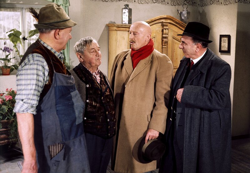 (v.li.): Beppo Brem (Hias, Hoteldiener), Hans Moser (Großvater Nikodemus Köberl), Hubert von Meyerinck (Direktor Friedrich Wilhelm Dünkelberg), Michel Lang (Haslinger, Wirt).