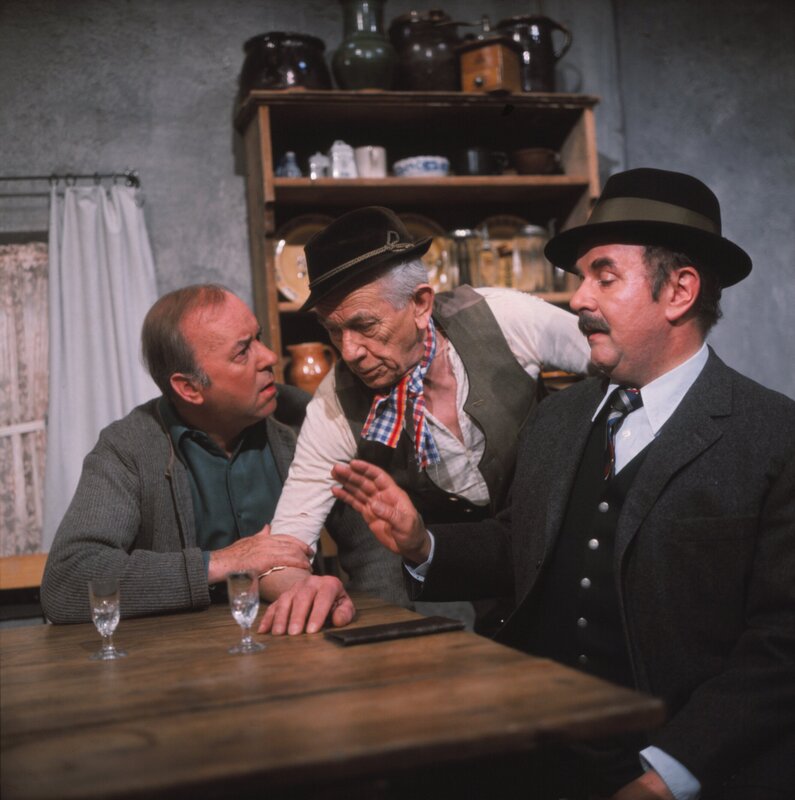 Der Handel um den Großvater (Ludwig Schmid-Wildy, Mitte). Der reiche Haslinger (Walter Sedlmayr, rechts) bietet eine hohe Summe für den Großvater, und der Kreithofer (Toni Berger) ist ganz entsetzt darüber, dass er seinen Großvater verkaufen soll. Weiteres Bildmaterial finden Sie unter www.br-foto.de.Bild: © BR/Foto Sessner