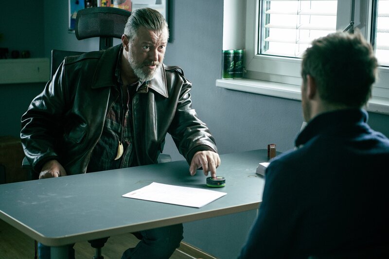 Speditionschef Zuko (Michael Thomas, links) versucht seinen neuen Mitarbeiter (Frederick Lau) von seinem Kautabak zu überzeugen.Bild: © Christian Anwander / ORF, BR, Lotus-Film