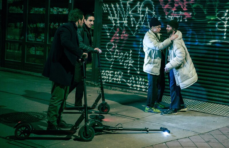 Von links: Freddy (Frederick Lau) trifft auf Rapper Momo (Pislik88) und die beiden Künstler Martin (Simon Steinhorst) und Grandits (Martin Grandits).Bild: © Christian Anwander / ORF, BR, Lotus-Film / BR/Lotus-Film/ORF/Christian Anwander