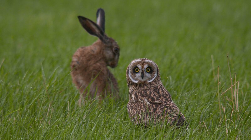Sumpfohreule und Hase, zwei Arten, die unterschiedlicher nicht sein könnten. Aber beide leben von dem, was die Wiesen Schleswig-Holsteins hergeben.Bild: © NDR/NDR Naturfilm/Doclights/Uwe Anders