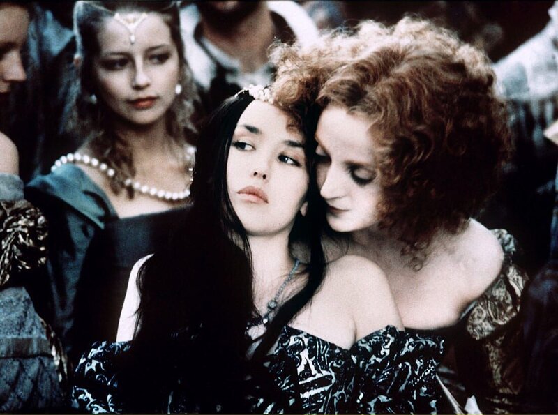 Königin Margot (Isabelle Adjani, vorne links) erkundigt sich auf der Hochzeitsfeier bei ihrer Vertrauten Henriette de Nevers (Dominique Blanc, vorne rechts) nach attraktiven Jünglingen.