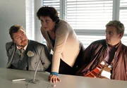 ARD DIE BLÜCHERBANDE, Deutschland 2009, Regie Udo Witte, am Montag (13.06.11) um 16:15 Uhr im Ersten. Hauptkommissarin Schmitz-Kesselhoff (Mona Seefried) will Werner (Armin Rohde, li.) und Ollie (Sebastian Bezzel) zu einem Geständnis bewegen.Bild: © ARD Degeto/Hans-Joachim Pfeiffer