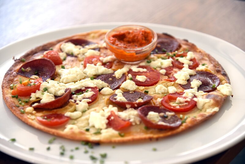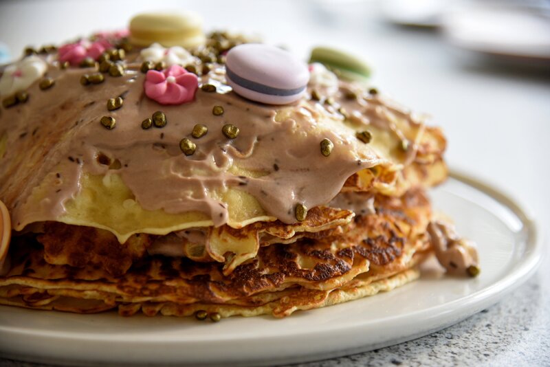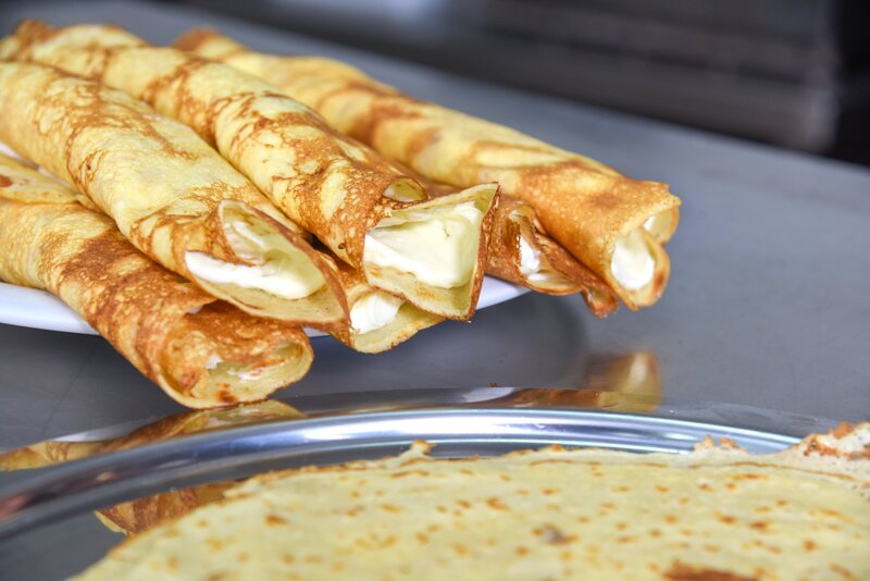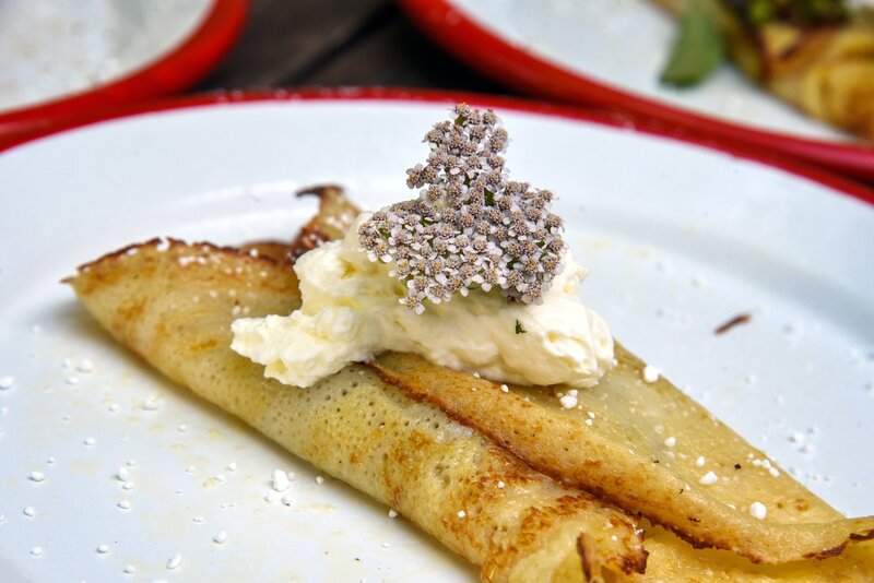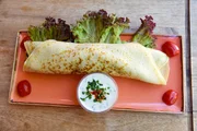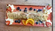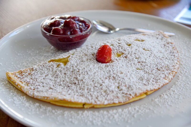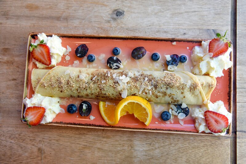 Süße Palatschinken gefüllt mit Schokocreme garniert mit Schlagobers, Trauben, Heidelbeeren, Erd-beeren und Mandelsplitter aus dem Gasthaus Salettl in Wien.
