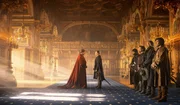 Kardinal Richelieu (Eric Ruf, l.), lässt sich von Capitaine de Tréville (Marc Barbé, 2.v.l.) berichten, dass die drei Musketiere Porthos (Pio Marmaï, 3.v.l.), Aramis (Romain Duris, 3.v.r.) und Athos (Vincent Cassel, 2.v.r.) bei verbotenen Duellen mit D'Artagnan (François Civil, r.) erwischt wurden.Bild: © ORF/Constantin Film