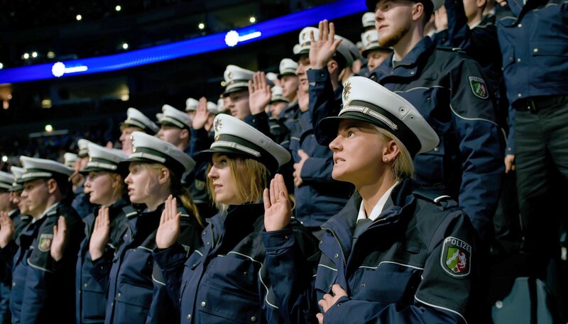 Leonie Funke (vorn, r) spricht als eine von 3000 AnwärterInnen in der Lanxessarena den Eid.Bild: © WDR/Dombauhütte
