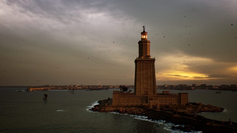 Computeranimation: Der Leuchtturm von Alexandria war mit über 120 Metern Höhe eines der Sieben Weltwunder der Antike. Er verdeutlicht die Bedeutung des Hafens von Alexandria für die römische Seefahrt. Der Leuchtturm von Alexandria stand auf der Insel Pharos. Das Wort "Pharos" wurde weltweit zu einem Synonym für Leuchttürme. Von dem Bauwerk ist leider nichts erhalten.Bild: © ZDF und Jörg Courtial