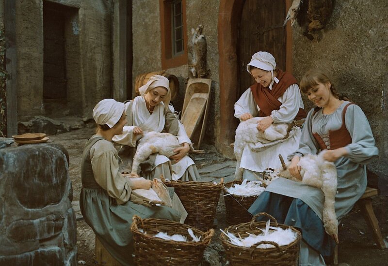 3. Prinzessin Aurinia ist nun eine gewöhnliche Magd wie die anderen und muß die Gänse des Königs hüten. (Mägde: Berta - Marylu Poolman, Gudrun - Angelika Böttiger, Marie - Anne Kasprzik, Hanne - Sylvia Mißbach).Bild: © ZDF
