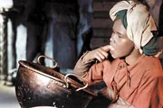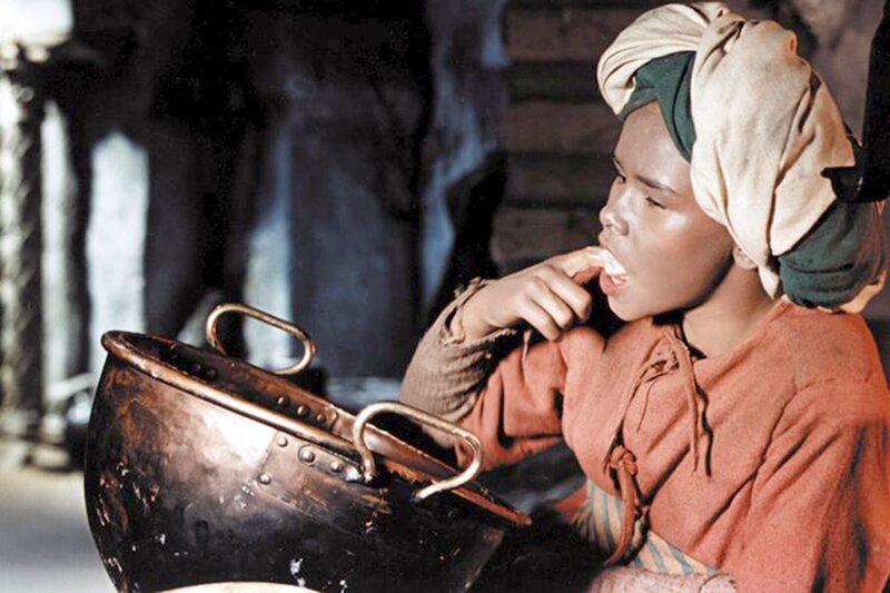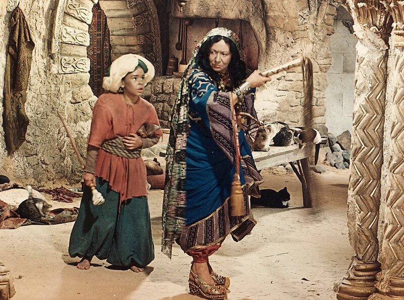 Der kleine Muck (Thomas Schmidt, li.) ist entsetzt darüber, dass die seltsame Frau (Trude Hesterberg, re.) ihn nicht mehr fortgehen lassen will.Bild: © rbb/ZDF/Cine Aktuell
