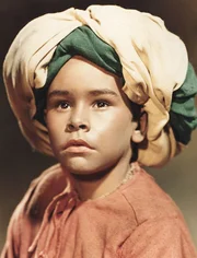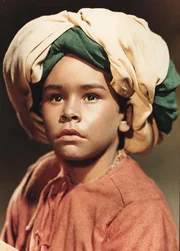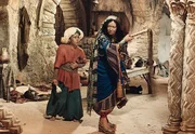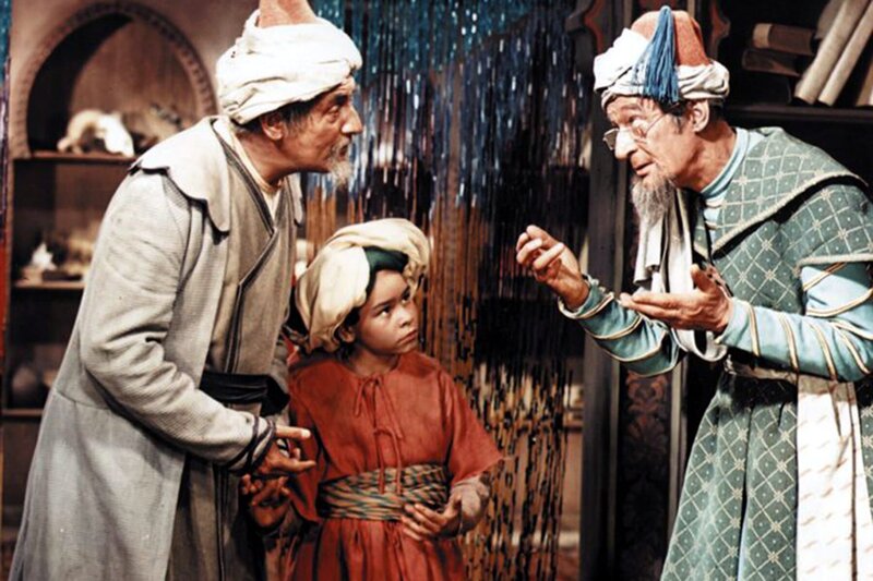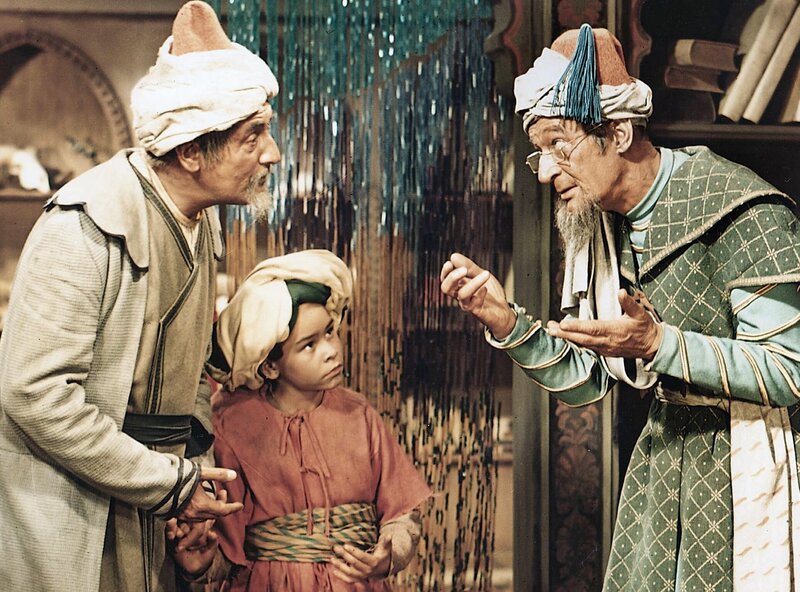 Mucks Vater Mukrah (Friedrich Richter, li.) versucht den kleinen Muck (Thomas Schmidt, Mi.) in der Koranschule unterzubringen, doch der Schulmeister (Wolf von Beneckendorff, re.) will den kleinen buckligen Jungen nicht aufnehmen.Bild: © Progress Film-Verleih/Eduard Neufeld