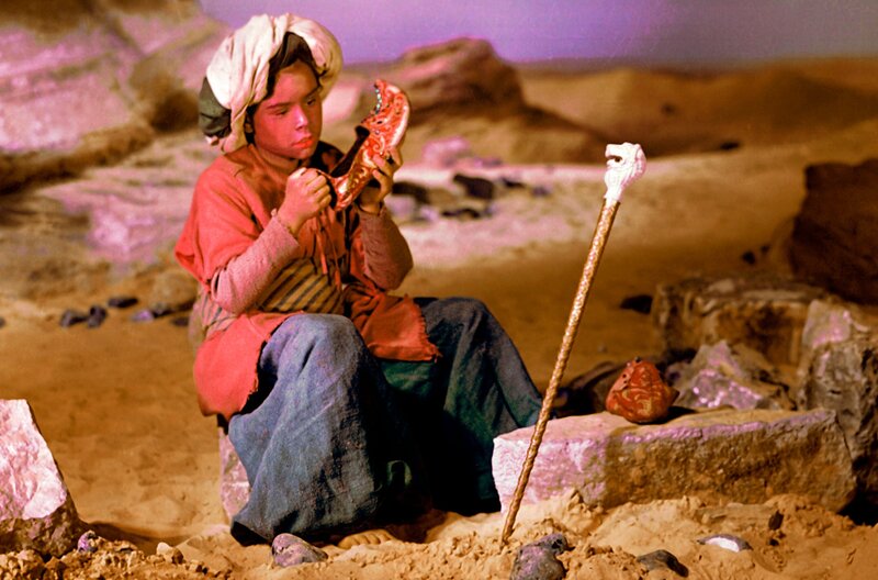 Im Orient lebt ein kleiner aufgeweckter Junge namens Muck, der einen Buckel hat und den alle verhöhnen und auslachen. In all seinem Jammer läuft er in die Wüste, um den Kaufmann zu suchen, der das Glück zu verkaufen hat. Den Kaufmann findet er nicht, aber dafür ein Zauberstöckchen und Zauberpantoffeln, mit denen er schnell wie der Blitz laufen kann. Märchenklassiker DEFA 1953 - Der kleine Muck (Thomas Schmidt) begutachtet die rasenden Zauberpantoffel und den verzauberten Stab, der Schätze findet. Beides hat er einer wundersamen Zauberin entwendet.Bild: © rbb/Progress Film-Verleih/Eduard Neu