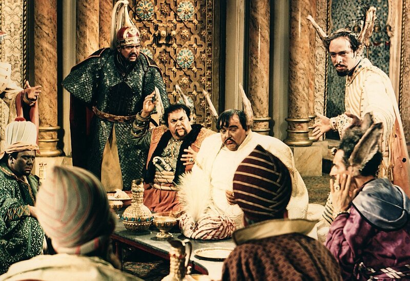Der Sultan (Alwin Lippisch) und seine räuberischen Ratgeber stellen mit Entsetzen fest, dass ihnen plötzlich Eselsohren gewachsen sind.Bild: © ZDF/Cine Aktuell