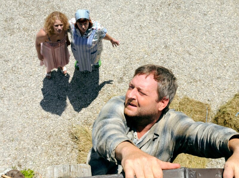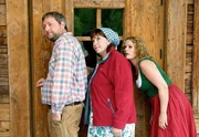 Theres (Elfi Eschke) und Katti (Susanna Knechtl, links) müssen Karli (Maximilian Krückl) helfen, der vom Dach der Hütte zu stürzen droht.Bild: © NDR/ARD Degeto/Mona Film/Oliver Roth