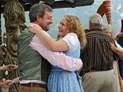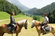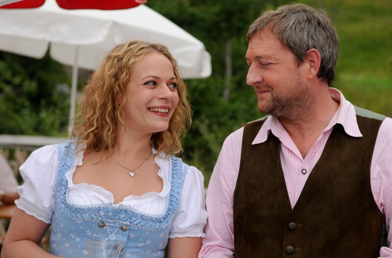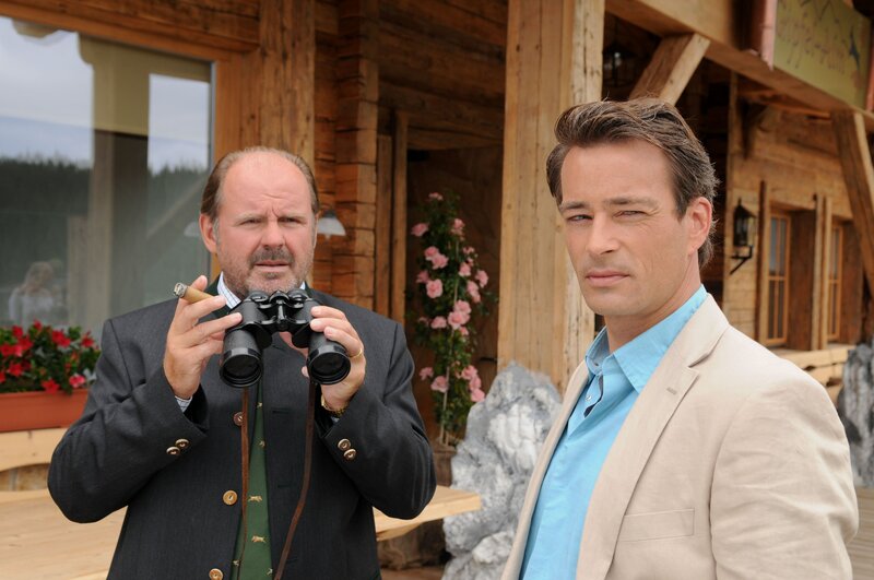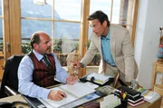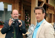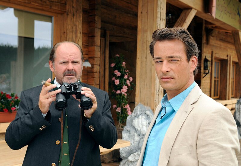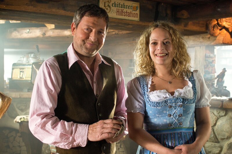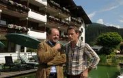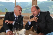 "Die Hüttenwirtin", Improvisationskunst ist gefragt, als Sandra von ihrem Vater die Almwirtschaft 'Hüttenwirt' erbt. Inzwischen mehr Stadtmensch als Kind der Berge, hat die Werbefachfrau mit Gastronomie rein gar nichts am Hut und will sich daher von der Berghütte so bald als möglich trennen. Doch als Sandra nach Tirol reist, um den Verkauf abzuwickeln, merkt sie schnell, dass das Schicksal wohl anderes mit ihr vor hat. Die Liebe zur alten Heimat flammt wieder auf - zusammen mit Sandras unerschrockenem Kampfgeist. Im Bild (v.li.): August Schmölzer (Xaver Riemer), Jan Sosniok (Markus Riemer).Bild: © ORF/Mona Film