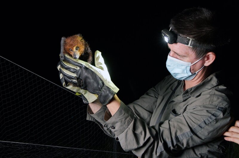Wissenschaftler mit Maskarenen-Flughund: Die Art war auf der Insel La Réunion eigentlich schon ausgestorben. Nun haben sich wieder einige Exemplare dort angesiedelt.Bild: © Cyril Ruoso/Prospect TV/Nomades / © Cyril Ruoso/Prospect TV/Nomades