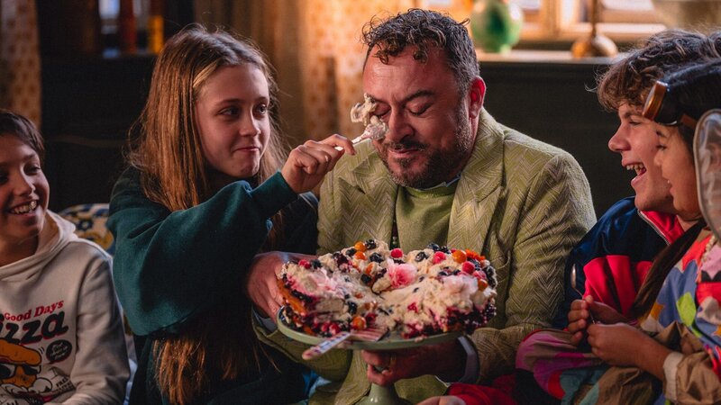 Kirk (Alfred Rivera, links), Katinka (Ida Skelbæk-Knudsen, 2.v.l. ), Miss Nelly (Jakob Fauerby, 3.v.l.), Tristan (Alfred Nordhøj Kann, 2.v.r. ) und Petra (Amelia Ahmad Abdullatif, rechts) haben eine Menge Spaß bei der Tortenschlacht.Bild: © ZDF/Georg Bussek