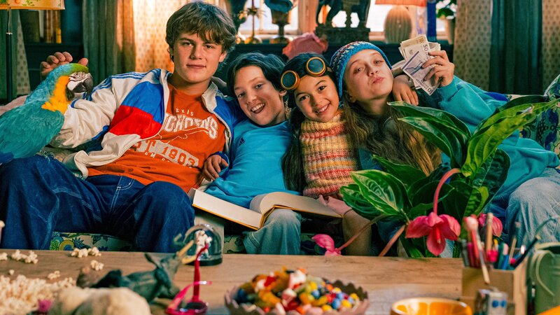 Die vier Geschwister Tristan (Alfred Nordhøj Kann, links), Kirk (Alfred Rivera 2.v.l.), Petra (Amelia Ahmad Abdullatif 2.v.r.) und Katinka (Ida Skelbæk-Knudsen rechts) und Captain, ihr Papagei haben viel Spaß miteinander in ihrer gemütlichen Wohnung in der Silberstraße.Bild: © ZDF/Georg Bussek