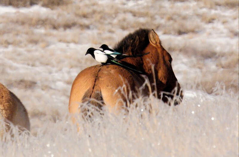 Elstern, wie diese beiden in der mongolischen Steppe, ernähren sich im Winter vorwiegend von Parasiten, wie z.B. Zecken, welche sie von Weidetieren picken. Wahrscheinlich kamen sie so auch zu ihren langen Schwanzfedern – um auf den Tieren besser balancieren zu können.Bild: © WDR/Text und Bild Medienproduktion/Robert Sigl