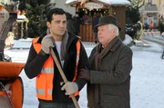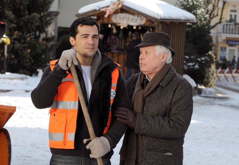 Der Sternekoch Martin (Erol Sander) arbeitet nach dem Tod seiner Frau als Straßenkehrer. Sein Vater Joseph (Peter Weck) muntert ihn auf.Bild: © ORF