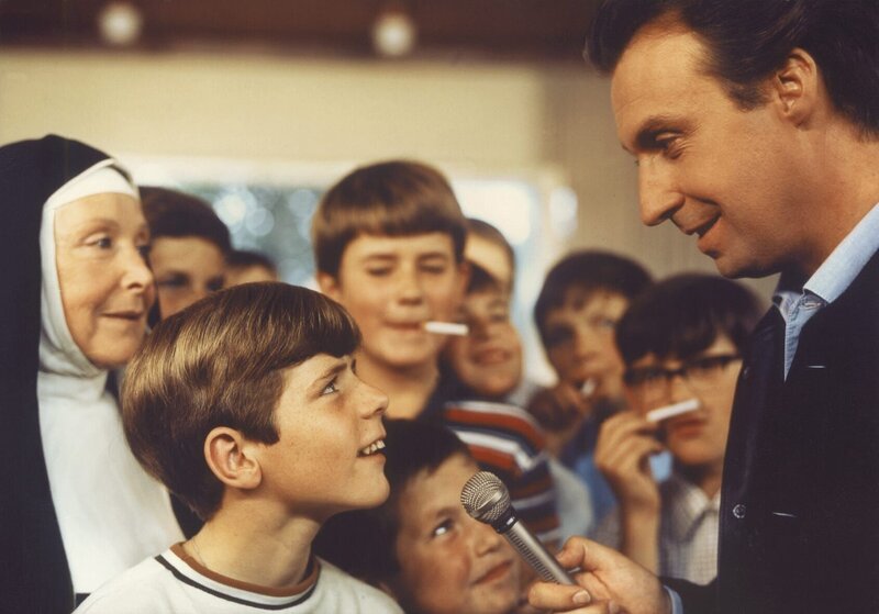 Der lebenslustige Schweizer Fernsehreporter Dr. Peter Roland (Peter Alexander, rechts) soll eine Reportage zum Bildungsnotstand der Jugend drehen und lernt bei ersten Recherchen den musikalisch begabten Heintje (Heintje, vorn links) kennen.Bild: © MDR/Kineos