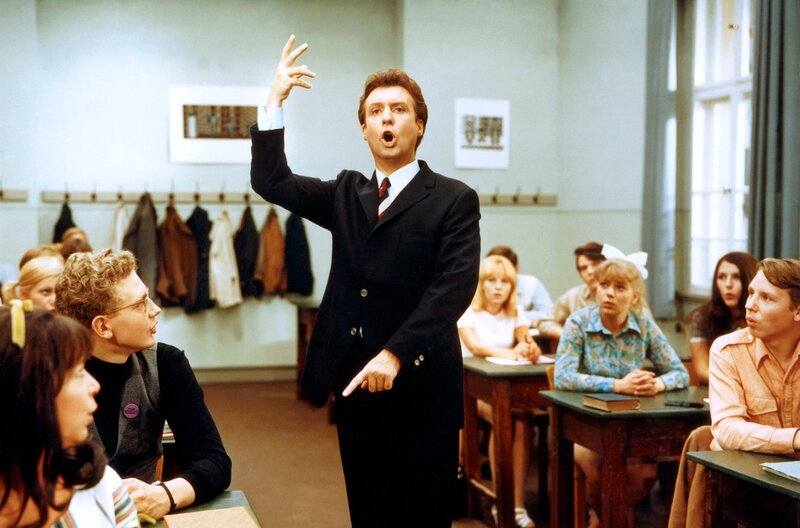 Um Fakten für eine seriöse Reportage zu sammeln, schmuggelt sich Dr. Peter Roland (Peter Alexander, mitte) inkognito als Austauschlehrer Dr. Tell an das Mommsen-Gymnasium in Baden-Baden und muss sich dort vor der Klasse 10a beweisen.Bild: © MDR/Kineos
