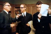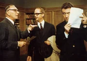 Doch das Versteckspiel von Dr. Peter Roland (Peter Alexander, rechts) fliegt auf, als der echte Dr. Wilhelm Maria Tell (Joachim Teege, Mitte) im Büro des Baden-Badener Oberstudiendirektors Dr. Gottlieb Taft (Theo Lingen, links) auftaucht.Bild: © MDR/Kineos