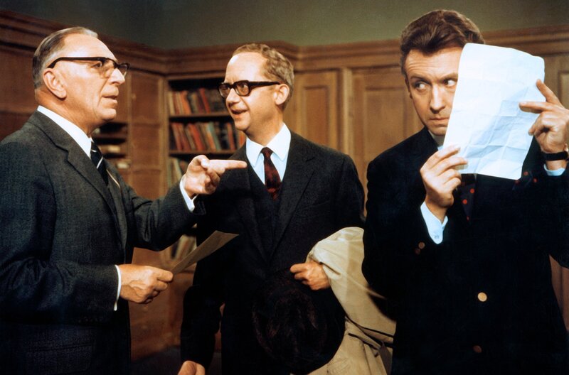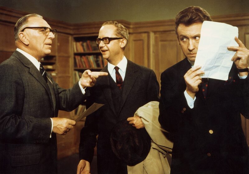 Der Rektor (Theo Lingen, l.) ist verwirrt: Wer ist denn nun der echte Lehrer - Dr. Burki (Jochaim Teege, M.) oder Peter Roland (Peter Alexander)?Bild: © ZDF und Terra Filmkunst GmbH