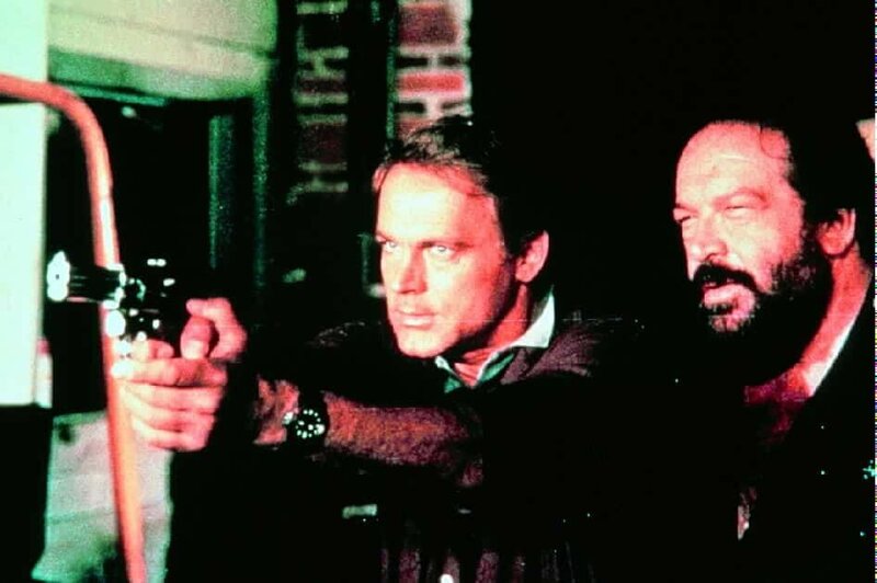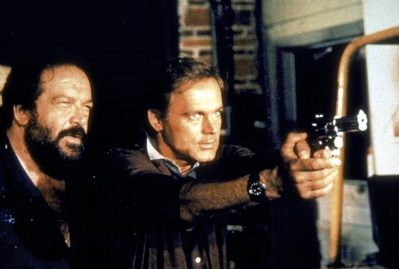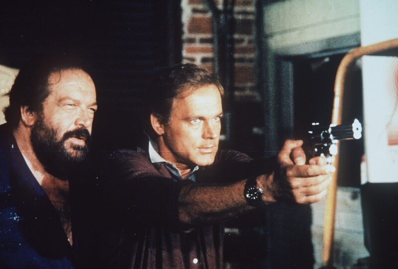 Die FBI-Agenten Steve Forrest (Bud Spencer, l.) und Doug Bennet (Terence Hill, r.) nehmen nach elf Jahren die Ermittlungen im Fall eines spektakulären Bankraubs wieder auf. Ein Mord bringt sie schließlich auf die richtige Spur ...Bild: © Tobis Film Lizenzbild frei