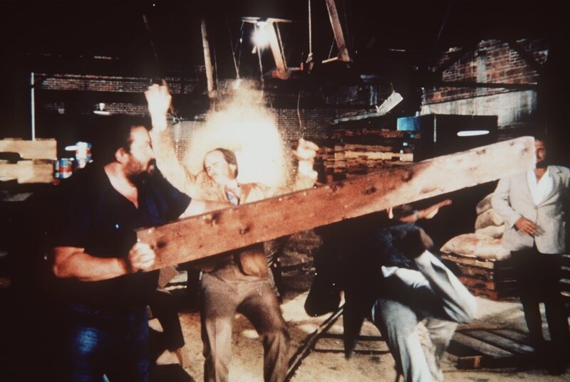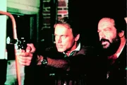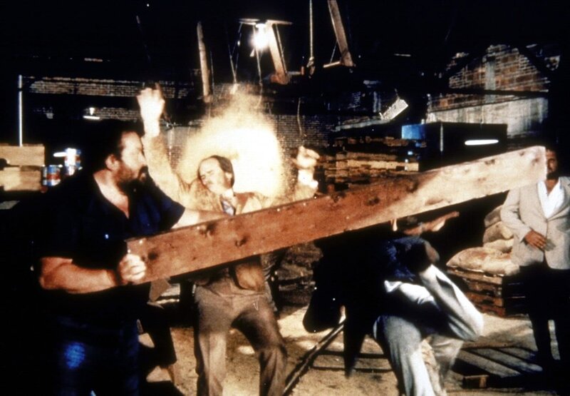 Es kommt zu einem alles entscheidenden Showdown in einem alten Lagerhaus. Bei dem Steve (Bud Spencer, l.) mit den Gangstern ordentlich aufräumt ...Bild: © Tobis Film Lizenzbild frei