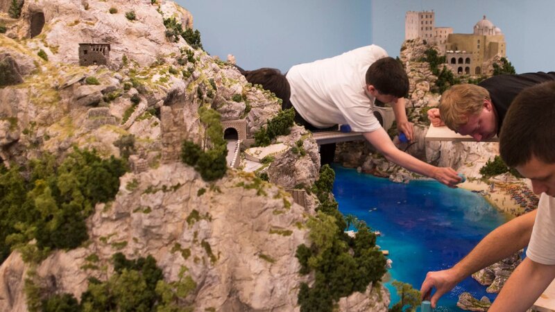 Die Betreiber der Modelleisenbahnanlage arbeiten ständig an der Entwicklung neuer Mini-Szenen und bauen Figuren, Autos, Häuser, Bäume und Züge in die verschiedenen Themenwelten ein.Bild: © Miniatur Wunderland