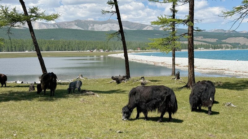 Yaks am Ufer des Chövsgöl-Sees, dem größten Trinkwasser-Reservoir der Mongolei.Bild: © NDR/Till Lehmann