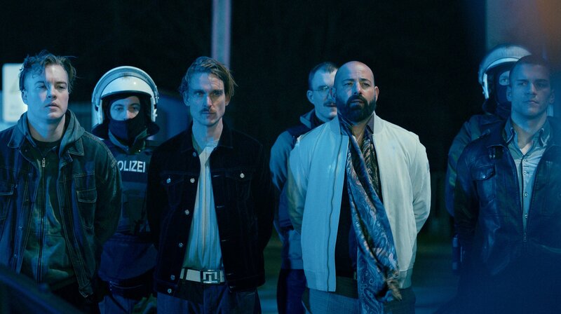 Was hat es zu bedeuten, dass der Thüringer Böhm (Daniel Sträßer, Mitte) mit seinem Kumpel Günni (Max Jellinek) bei dem Einsatz gegen Bekim Dalvina (Anton Noori) in Württemberg auftaucht?Bild: © SWR/Leonin Studios