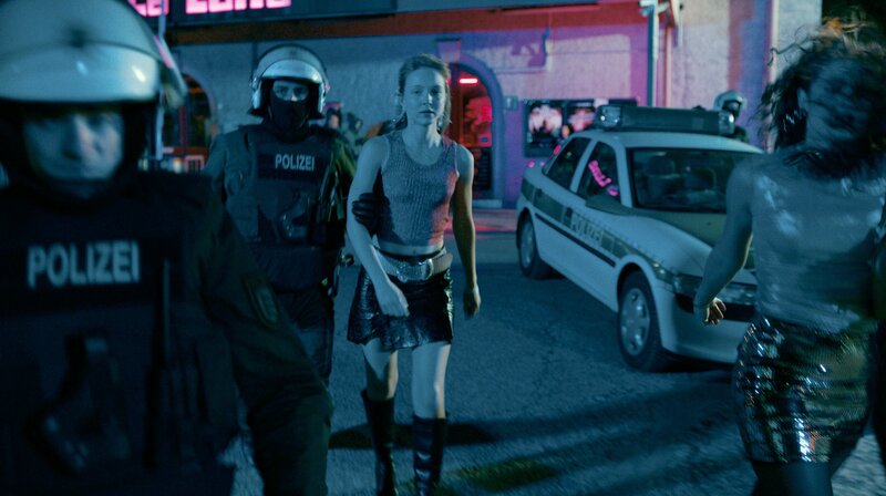Rebecca (Magdalena Laubisch) wird nach einem Einsatz als Lockvogel von ihren Kollegen zum Schein abgeführt.Bild: © SWR/Leonin Studios