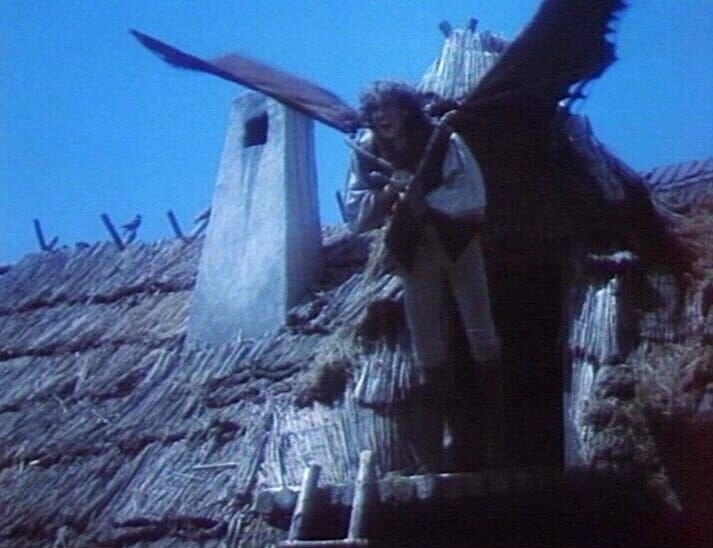 Jira (Jan Potmesil) steht plötzlich auf dem Dach und breitet geschusterte Lederflügel aus und ist auf und davon.Bild: © rbb