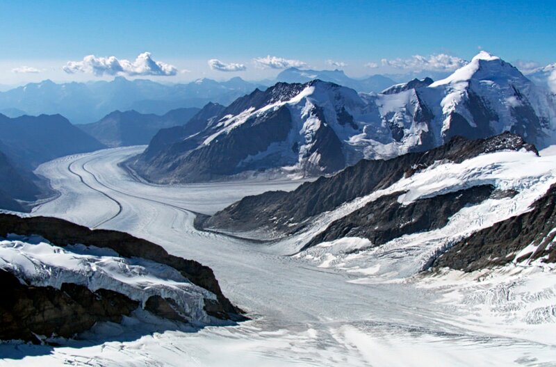 Mit gut 20 Kilometern Länge ist der Aletsch der größte Gletscher in den Alpen. Wie ein Fluss aus Eis erstreckt er sich durchs Hochgebirge. Noch wirkt er mächtig, doch sein Eisschild schmilzt Jahr für Jahr immer weiter ab.Bild: © SWR/Vidicom/Bardehle