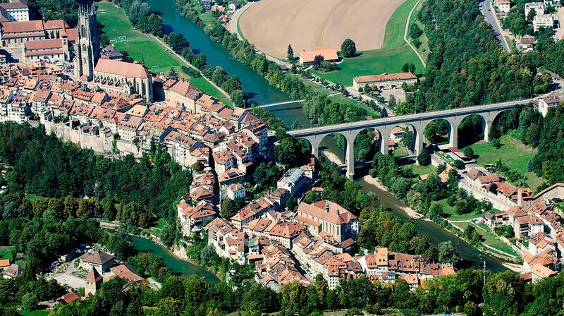 In einer Flussschleife der Saane liegt die Stadt Fribourg auf einem Felsen. Noch heute zeugen die prachtvolle Kathedrale und die herrschaftlichen Häuser vom Reichtum ihrer Gründer, dem schwäbischen Adelsgeschlecht der Zähringer.Bild: © SWR/Vidicom/Bardehle